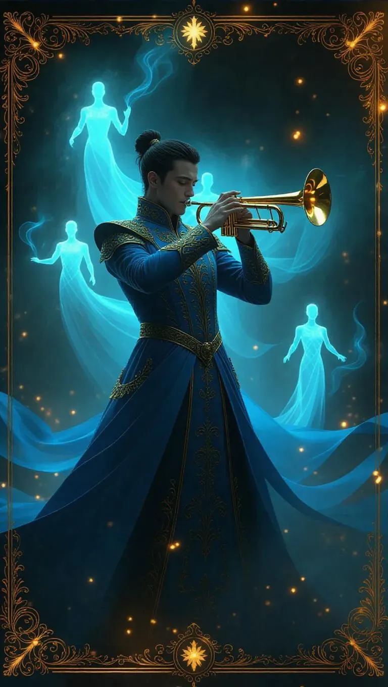 A spectral trumpeter in flowing azure robes plays a cursed melody, summoning glowing phantoms and shimmering lights. The scene is engulfed in mystic mist, framed by golden borders adorned with musical crescendos. Soft, celestial light enhances the transparency of the robes and specters, creating a hauntingly beautiful atmosphere. The style is radiant and magical, blending realism with supernatural elements.