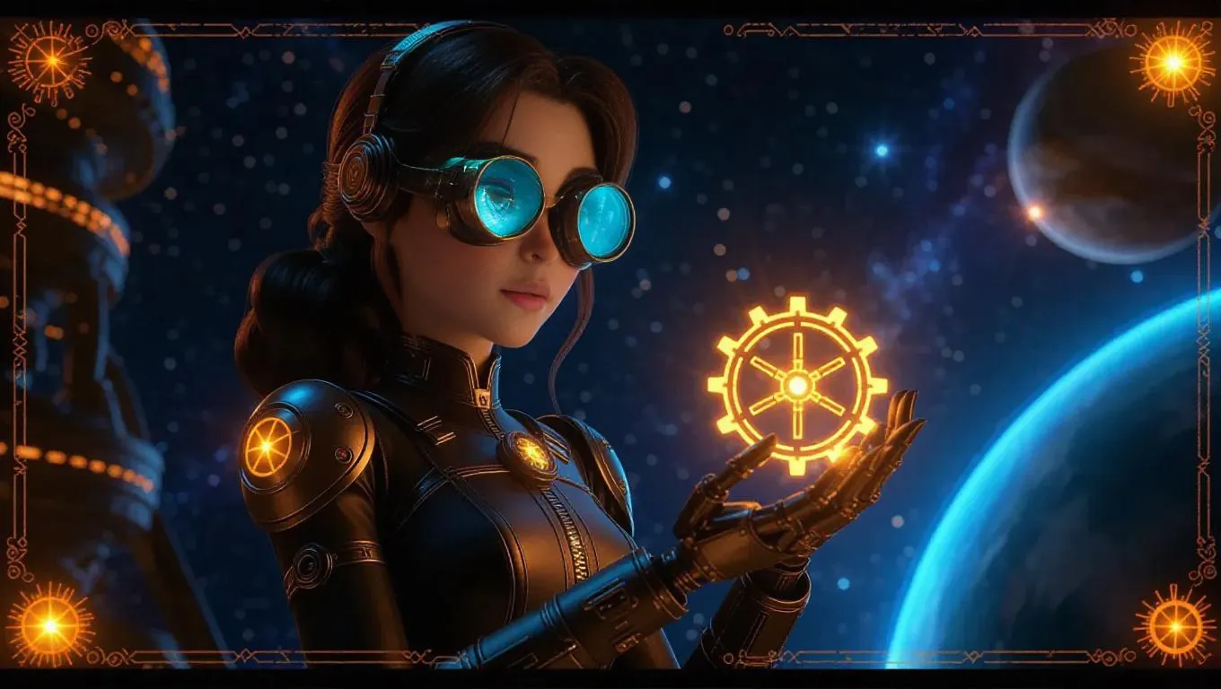 A steampunk inventor girl with a mechanical arm and night-vision goggles holds a glowing gear-powered device. She stands in front of a space station filled with stars and planets. The scene is framed with cosmic-themed borders and stardust patterns, bathed in a starlit glow. Detailed mechanical textures and space exploration design elements enhance the futuristic atmosphere. Soft, ethereal side light highlights her curious expression and the intricate gears, creating a dreamy yet adventurous feel.