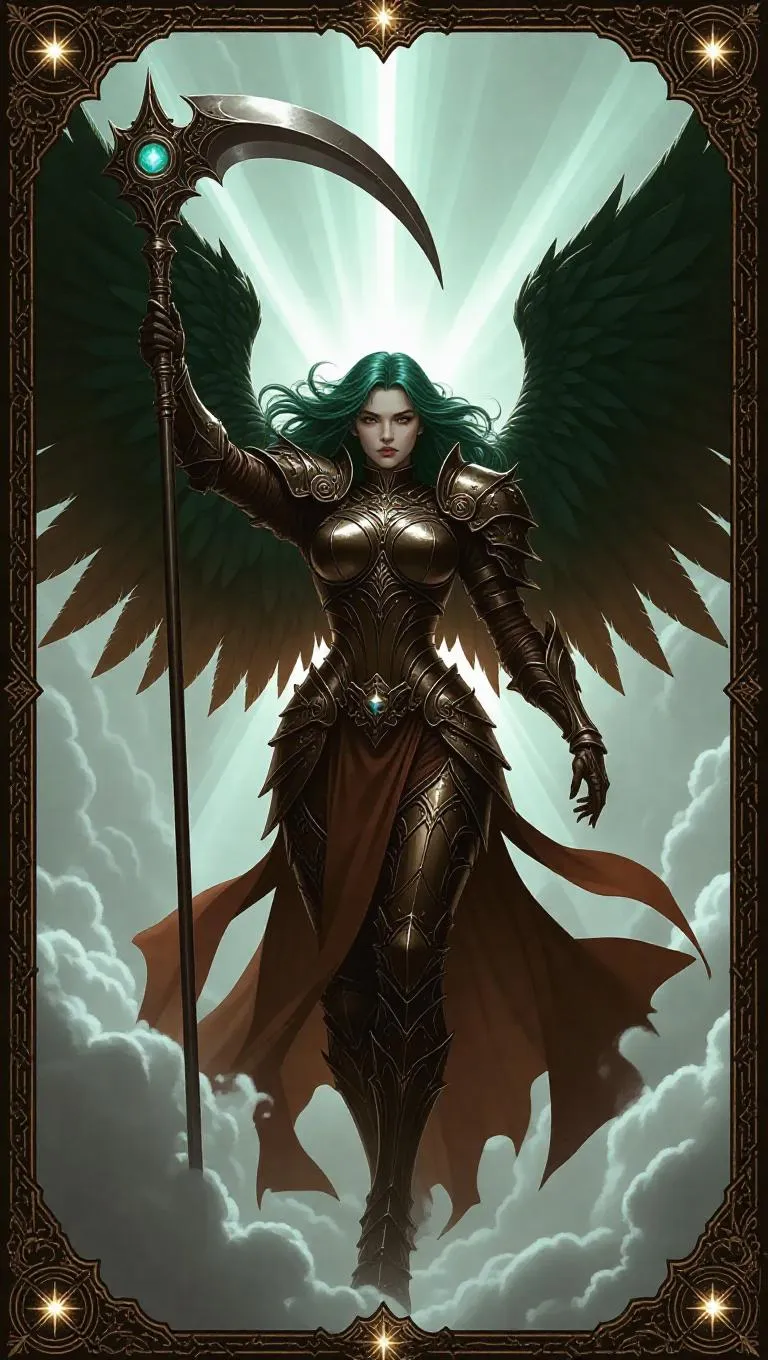 A heroic sea-green-haired battle angel, clad in deep brown armor and adorned with shadowy wings, holds a divine sickle aloft. Dazzling beams and misty clouds fill the background, creating an enigmatic atmosphere. The card is bordered with intricate writings, featuring shimmering effects and brown holographics, enhancing the sacred aura.