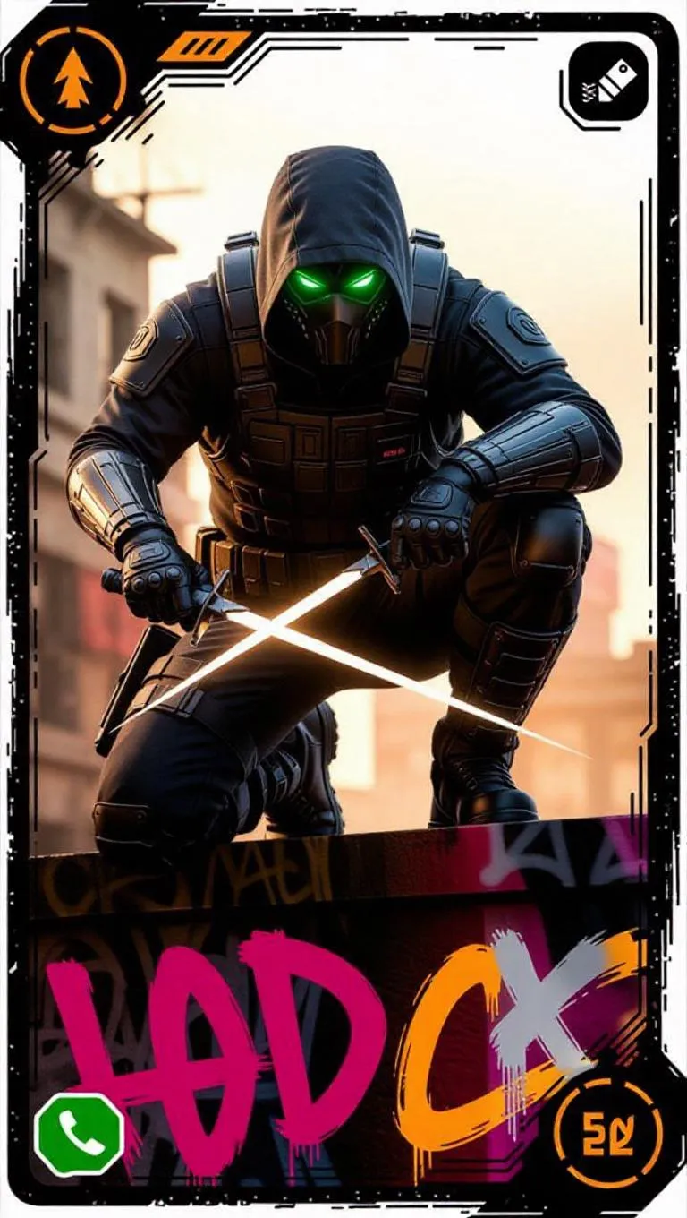 A cyberpunk assassin crouches on a graffiti-covered rooftop, sporting a gray tactical suit and wielding a pair of plasma knives. His green cyber-eye glows dimly. The collectible card showcases a gritty black border with digital noise effects, a rare-class icon, and fiery orange holographic lighting, complementing the urban decay theme.