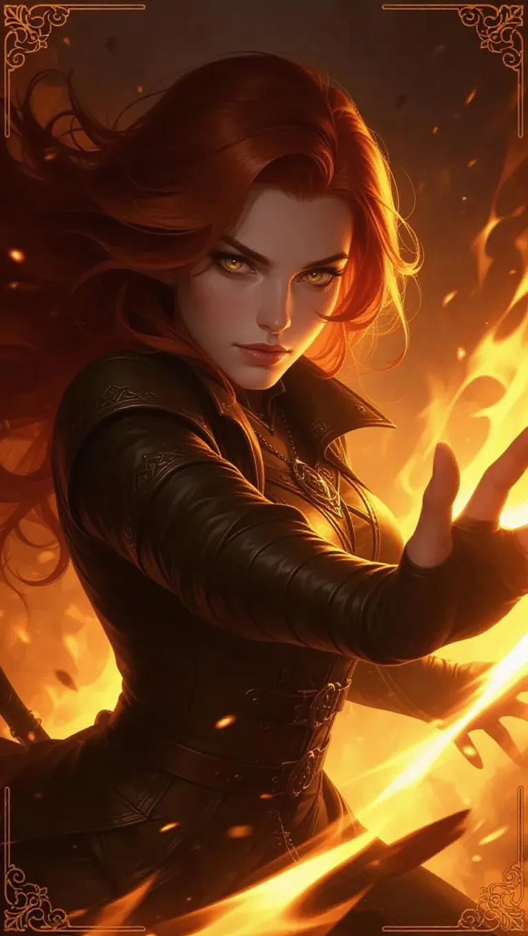 An agile huntress with fiery red hair and keen golden eyes casts a flaming trap, surrounded by flickering shadows and glowing orbs. The background features a chaotic blaze of flames and debris, with a collectible game card design featuring a striking copper frame, swift wind-element symbols, finely detailed leathers, and an opalescent surface. The lighting is moody, with sharp highlights from the flames and deep shadows from the smoke, evoking a suspenseful and thrilling atmosphere. The style is intricately detailed and vibrant, combining realism with fantasy elements.