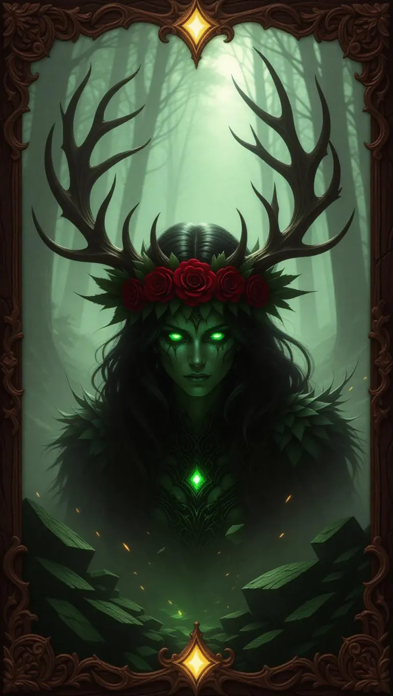 A corrupted forest spirit emerges from broken stones and decay, her antlers adorned with red roses. Her eyes glow an unsettling green, casting an eerie light as she manipulates the cursed nature around her. The scene is shrouded in a dense fog, with a carved wooden border framing the image, enhanced by a golden glow. The lighting is dim and atmospheric, with glowing embers adding to the dark ambiance. Style: Dark fantasy.