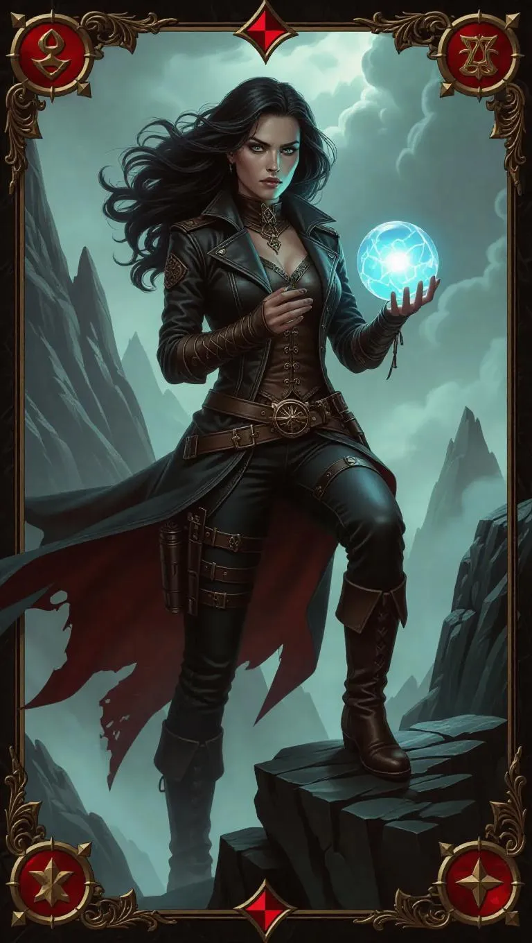 A fierce sorceress with stormy gray eyes, donned in a rugged leather jacket and knee-high boots, holds a glowing crystal orb while standing on a treacherous cliff. Jagged rocks and swirling clouds create a dramatic ambiance. The card border features dragon and shield motifs, accented with red and gold decorations, and adorned with topaz.
