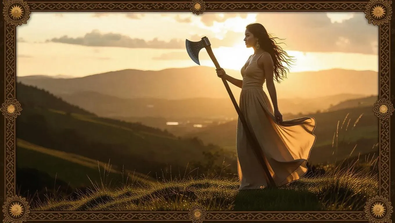 An exotic beauty with light brown skin, wearing a simple, flowing dress that flutters in the highland wind, holding a handcrafted axe while standing steadfast on a grassy knoll. The background showcases rolling hills with a brilliant afternoon sun, casting a warm, golden hue. The card border integrates intricate hill and sun motifs, accented with khaki and bronze decorations, and adorned with soft citrine.