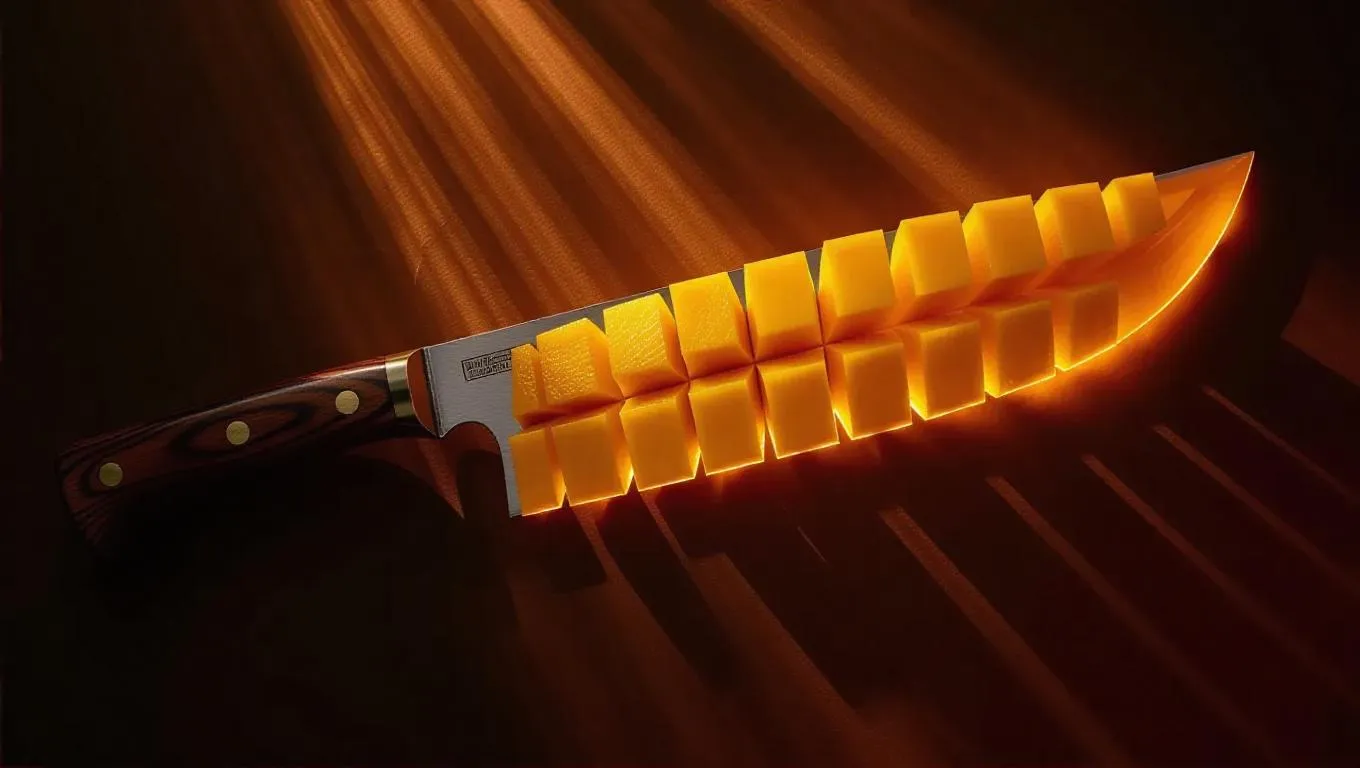 A unique machete crafted from vibrant mango slices, illuminated by a bright amber light, set against a classic, dark shadow background, creating a surreal and artistic composition.