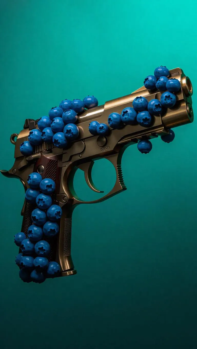 A sleek bronze metal gun intricately decorated with plump blueberries, glowing under a gentle teal ambient light, creating a surreal and captivating contrast between the weapon's cold metal and the organic, vibrant berries.