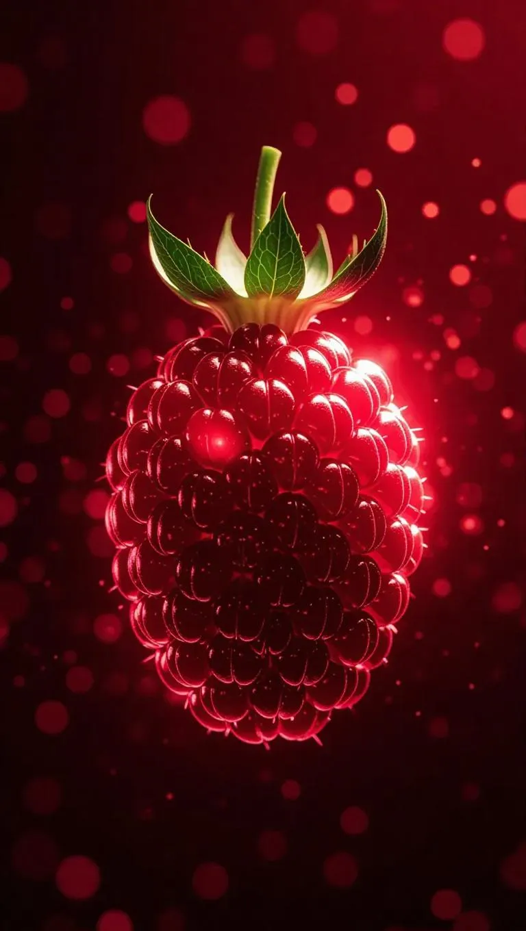 Text to ImageA grenade crafted from a raspberry, detailed texture with small beads and bright red color, enveloped in a glowing crimson energy aura, set against a dark background, emphasizing the surreal and vibrant nature of the fruit.Recreate