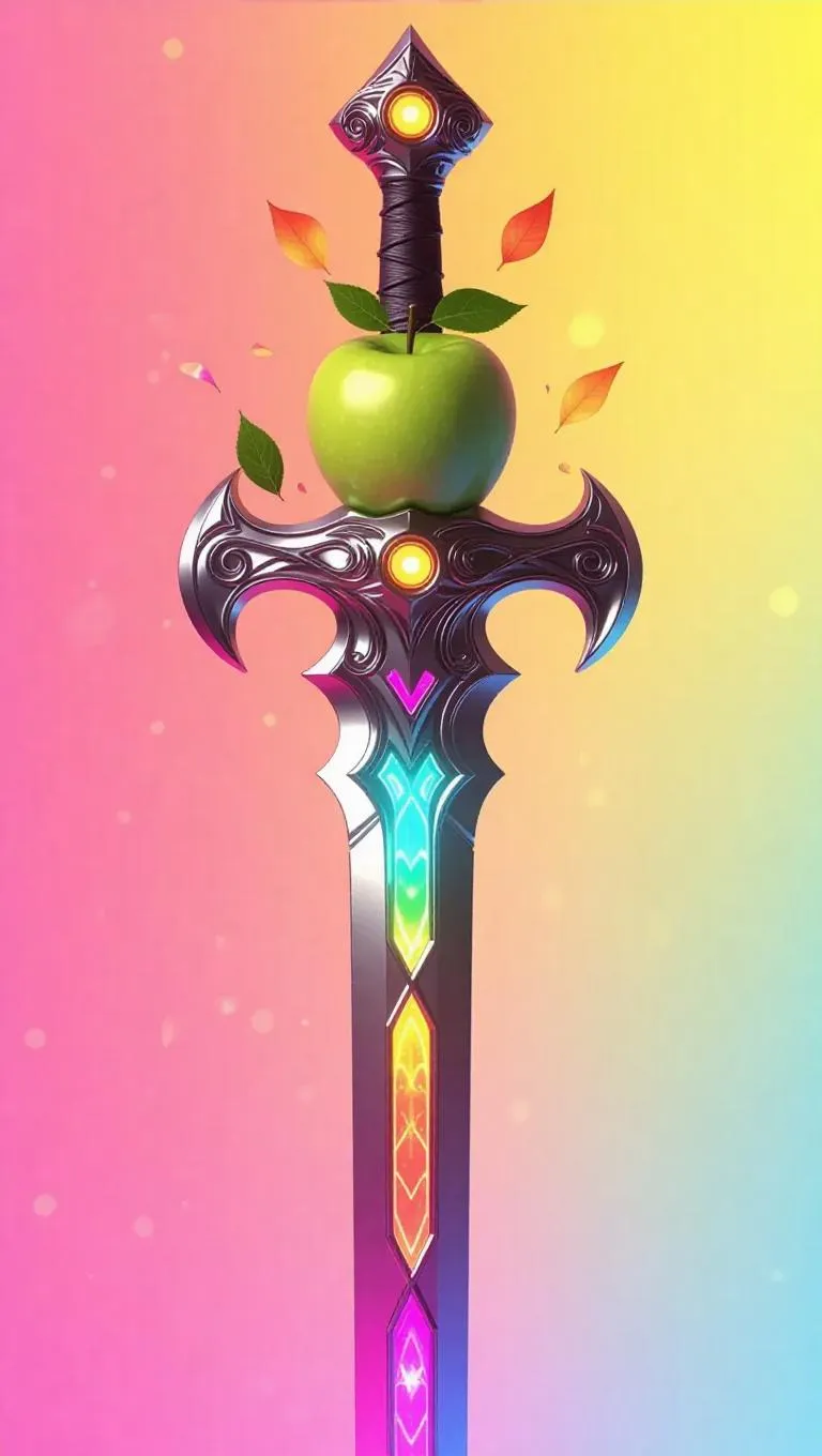 Text to ImageStylized concept art of a sword hilt crafted from apple peel, intricate detailing, vibrant colors, futuristic flair, contrasting textures, sleek and organic design, glowing accents, set against a bright, cheerful backgroundRecreate