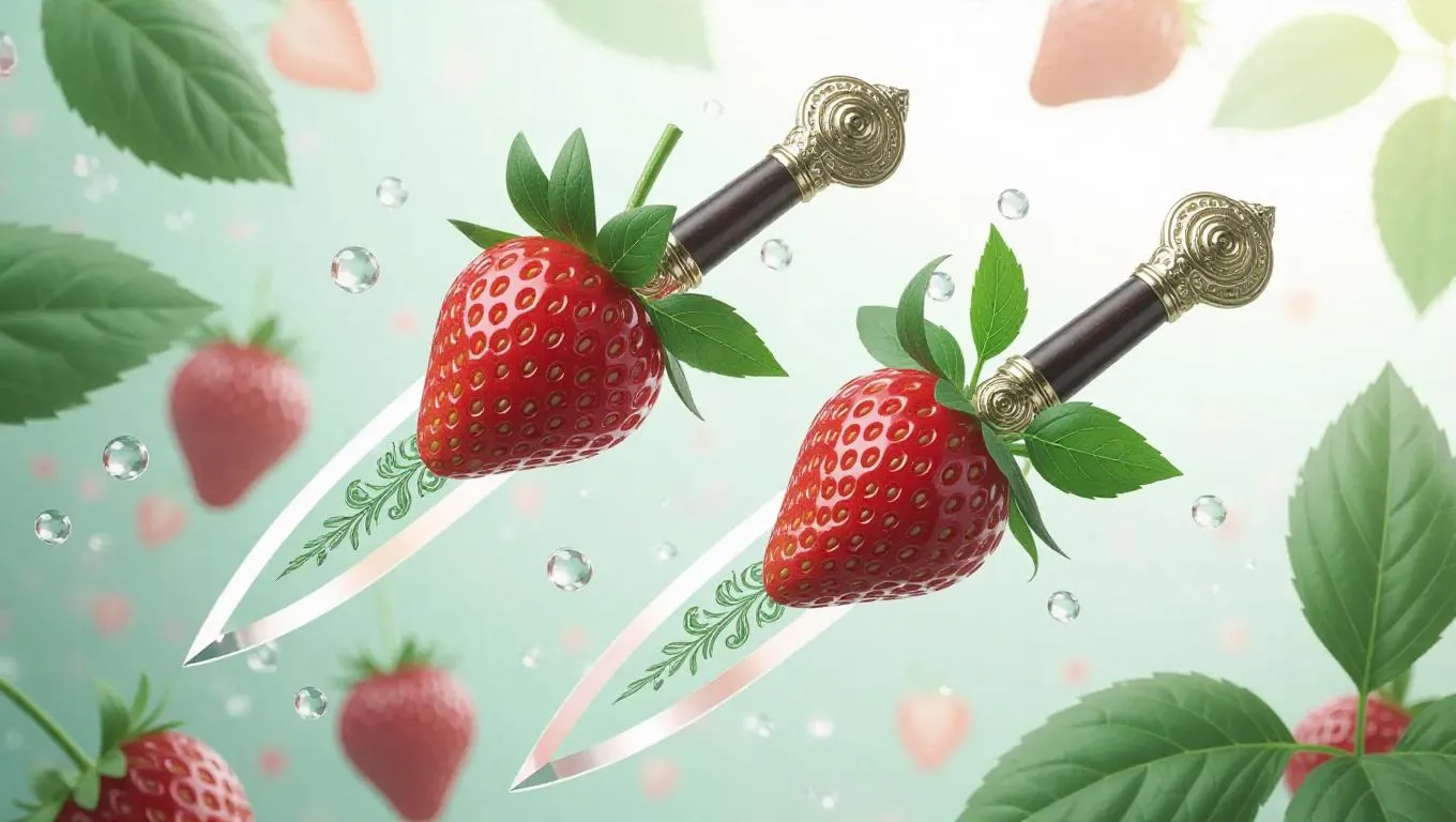 Dual daggers inspired by strawberries and basil leaves, floating composition, intricate blade designs with swirling strawberry patterns and basil leaf engravings, ethereal glow, set against a soft, dreamy background with subtle hints of garden.