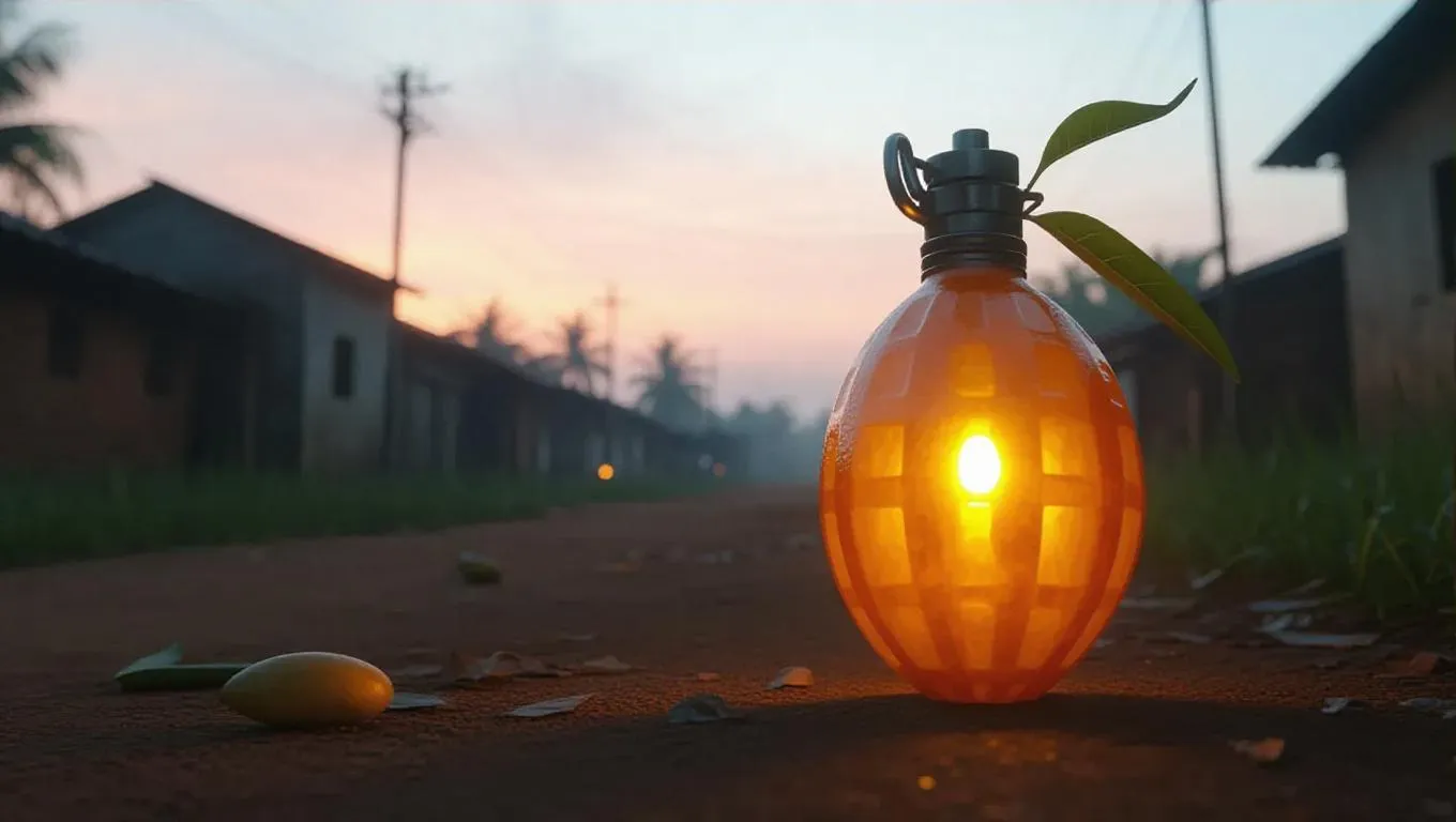A deep orange grenade, crafted from the fibrous pit of a mango, radiates a warm, golden glow. Set against a quiet village at dawn, the grenade's tropical origins and explosive energy are highlighted by the soft, early light casting long shadows and reflecting off the rustic buildings. The sky is a blend of pale pinks and soft blues, enhancing the grenade's vibrant color and creating a peaceful, serene atmosphere. The scene is captured with a soft, diffused light, emphasizing the natural beauty and tension. Style: Realistic.