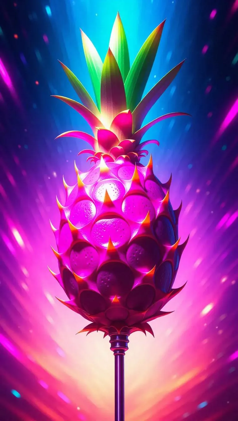 Spear with dragonfruit head, futuristic style, radiant patterns, luminous energy, bright colors, astral glow, complex designs, stellar flair, sci-fi elements, magical atmosphere