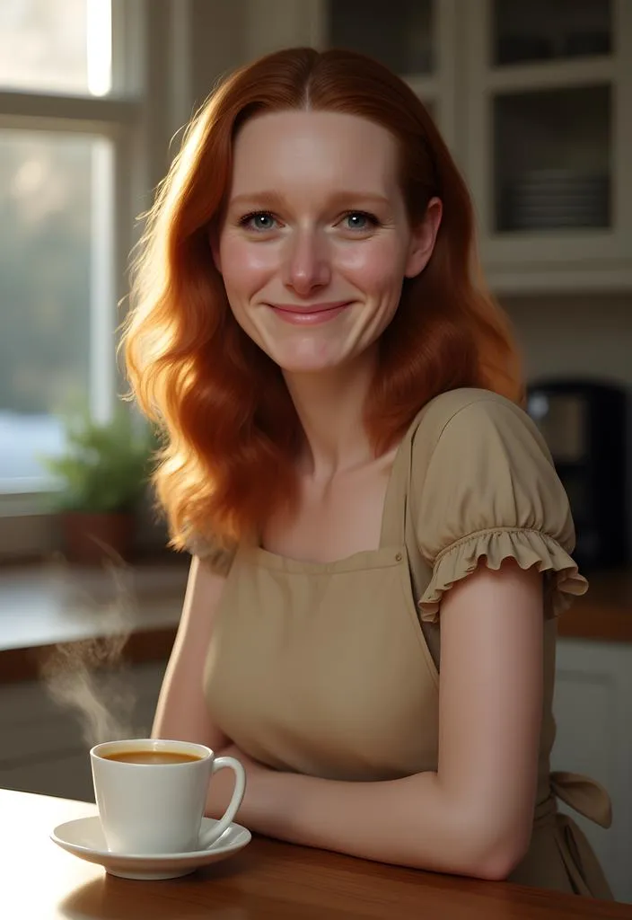 Create a cinematic AI-generated image of a warm, inviting redhead in a cozy kitchen. Featuring soft natural light, intricate details, and hand-drawn style blended with Blender renderer for ultra HD quality. Perfect for interior design inspiration, this waist-shot scene combines comfort, intimacy, and lifelike realism in vivid silver eyes and steaming coffee ambiance.