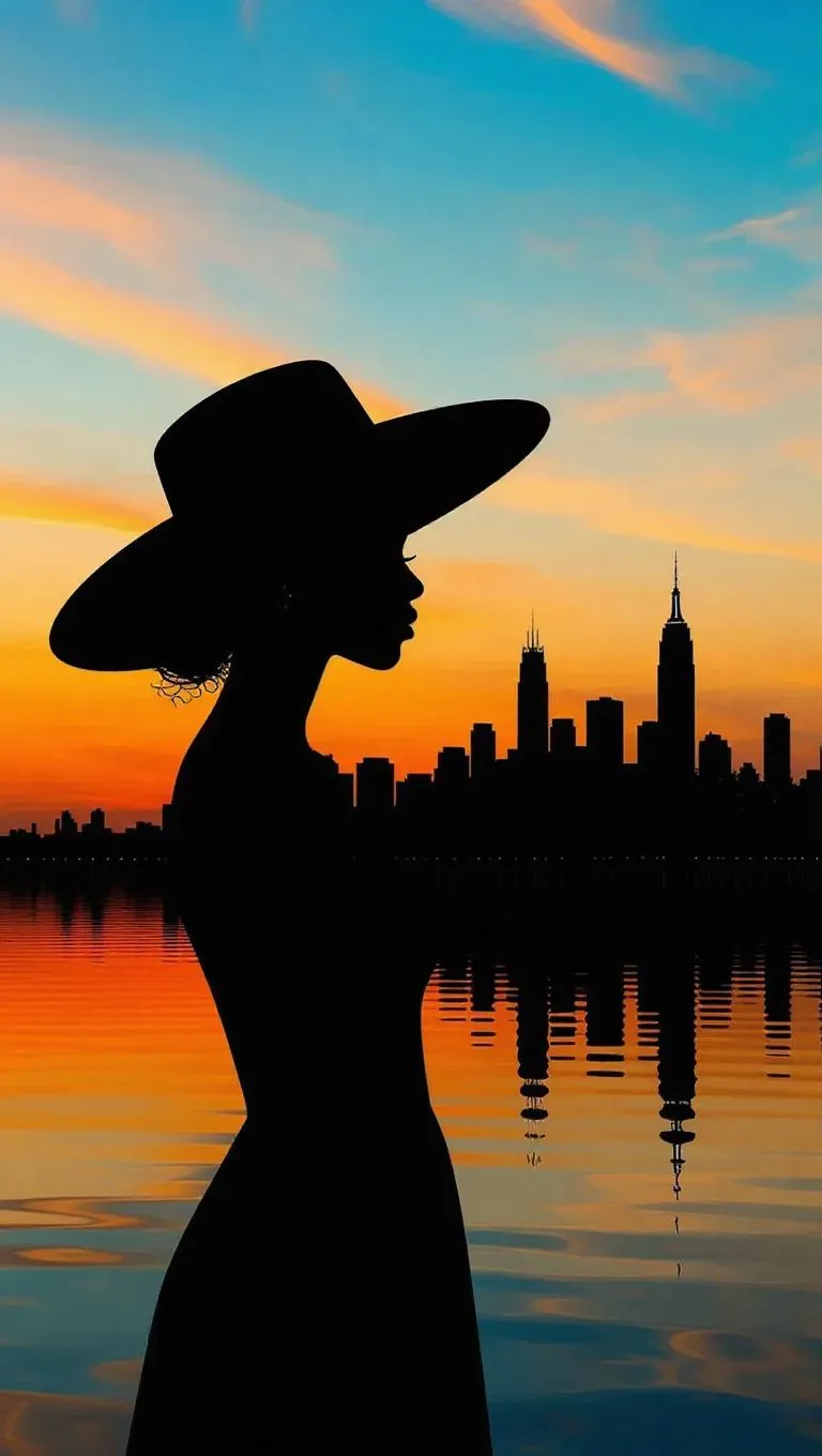 Create a serene AI-generated abstract painting of a silhouetted Black woman in a wide hat by water, blending earth-toned browns and oranges with a sunset city skyline. Transform text prompts into peaceful visuals using Vivago.ai's professional AI art tools for striking, professional-grade results.