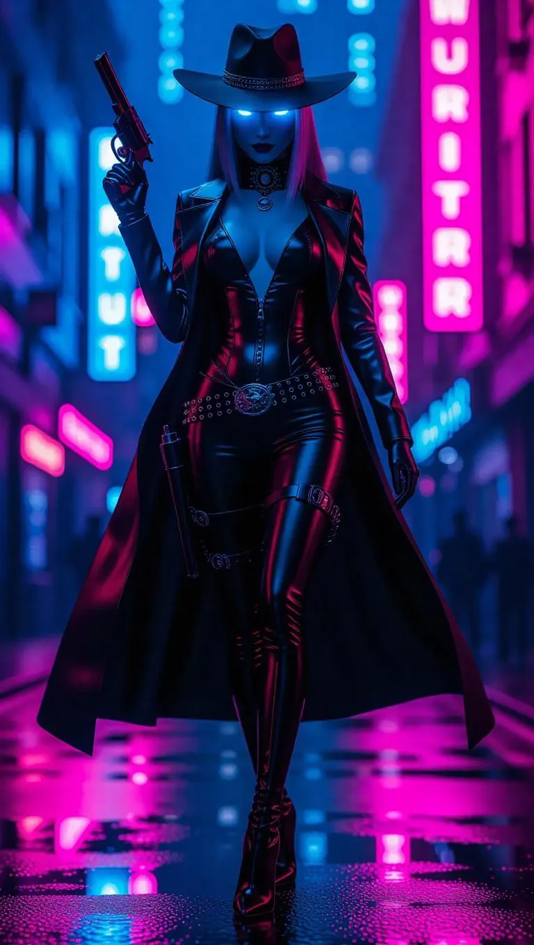 Create dynamic AI visuals with a futuristic sentient AI agent: sleek cyberpunk design, glowing blue eyes, neon textures, and edgy accessories (lasso belt, six-shooter). Stylish hat, form-fitting attire, stilettos, and busy cityscape background. Ideal for professional AI image generation blending sophistication, attitude, and cyberpunk aesthetics using Vivago.ai's advanced creative tools.