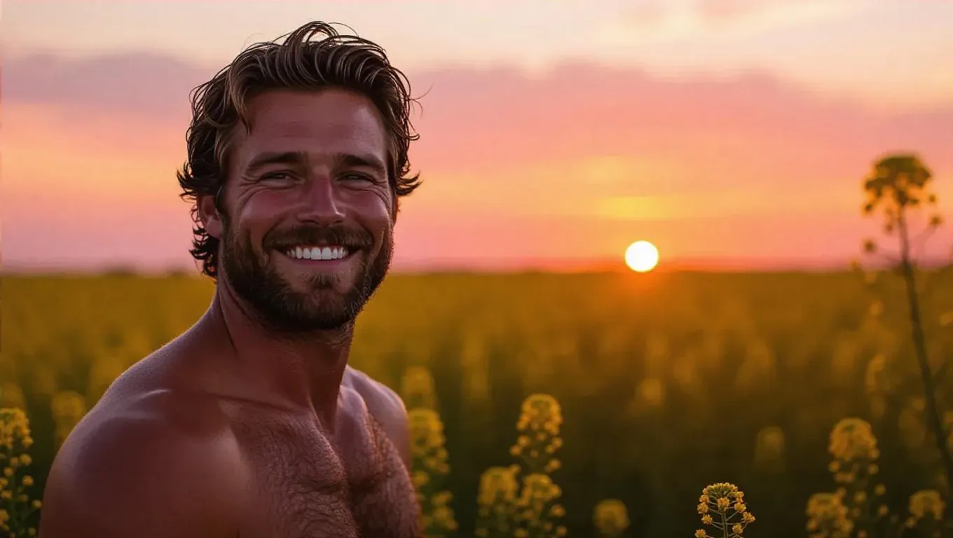 Generate realistic AI images of a shirtless American farmer smiling in sunset-lit yellow flower fields. Full-body POV composition highlights natural lighting, hairy chest details, and vibrant pink-orange skies. Perfect for agricultural branding, rural lifestyle visuals, or nature-inspired AI art projects with photorealistic quality.