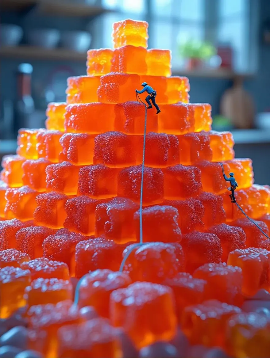 Generate an ultra-high definition AI image of towering orange Jello cubes shaped into a pyramid, viewed from a dramatic bottom-up perspective. A miniature climber ascends the textured surface with ropes, set against a blurred kitchen backdrop. Leverage VivaGo.ai's texture mapping and lighting tools for lifetailored, professional-grade visuals. Transform prompts into vibrant AI art with precision and creative flair.