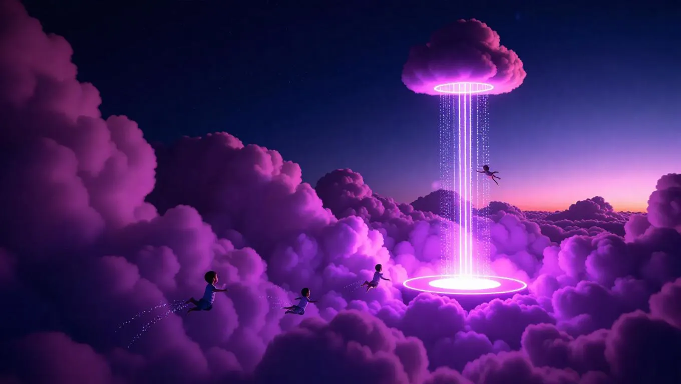 9. Towering cloud slides cascade down from the dusky pink sky, their surfaces dusted with ephemeral glitter. Children slide down at breakneck speed, leaving behind long, luminous trails of radiant starlight that arc gracefully through the air. At the base, a soft, fluffy cloud trampoline awaits, and every joyful jump sends countless sparkling specks flying into the enchanting atmosphere.