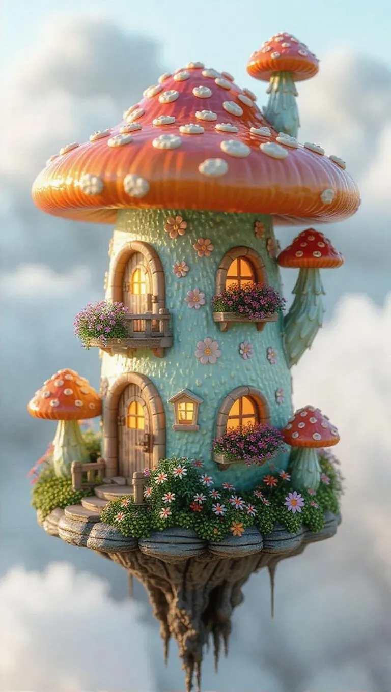 Miniature mushroom-shaped houses crafted from a blend of cloud and shimmering energy, floating joyfully above the frothy clouds. Bright caps with gradients and patterns, reliable spiraled stems. Tiny doors and windows with light curtains, flower boxes filled with luminous blooms, enhancing the ethereal charm.