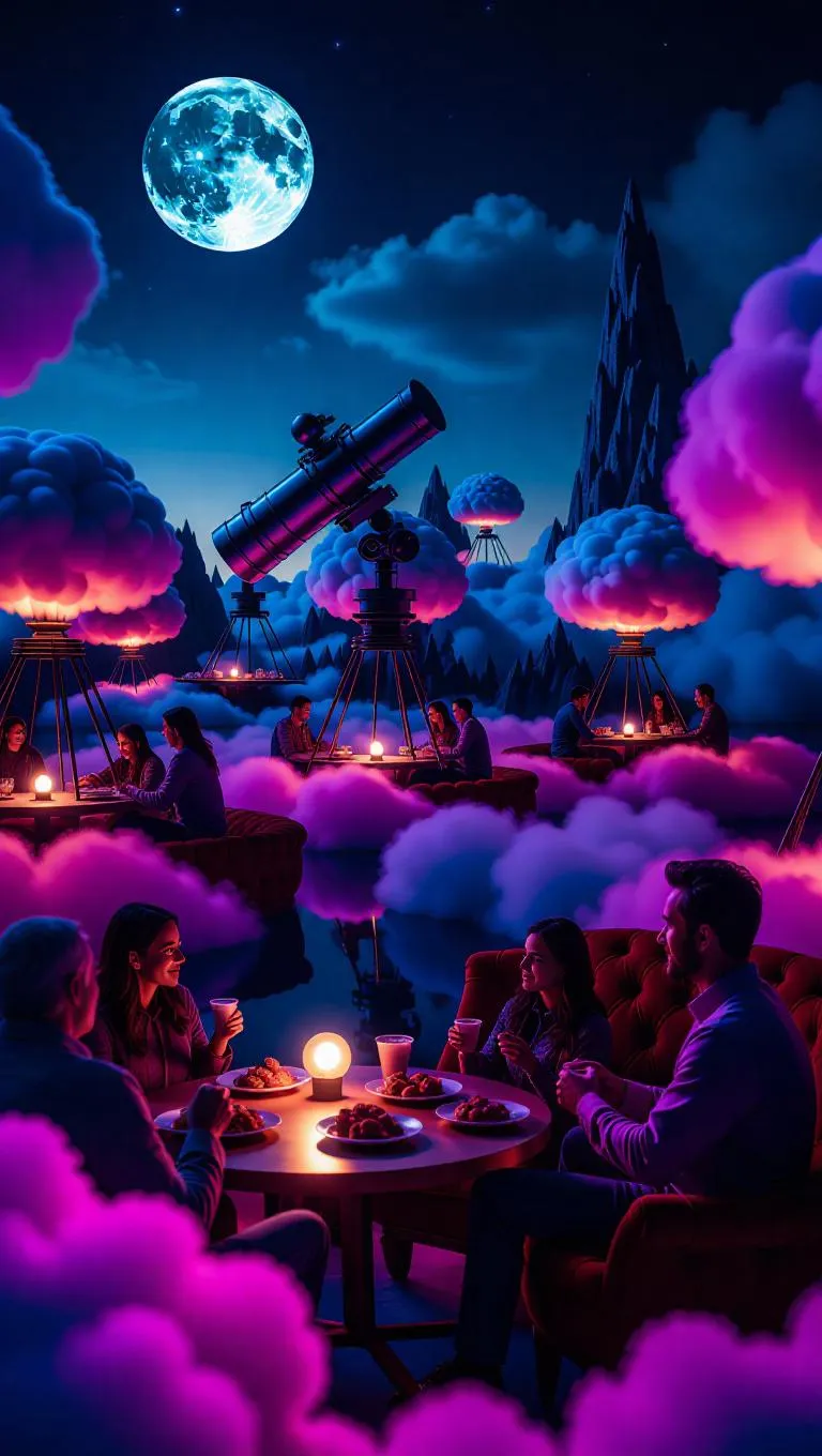 Guests gather on vibrant, floating islands adorned with high-tech telescopes and cozy seating areas. Expert astronomers share captivating stories and facts about the celestial bodies, while others savor snacks of fluffy cloud taffy and cosmic berry juice under the luminous glow of a full moon.