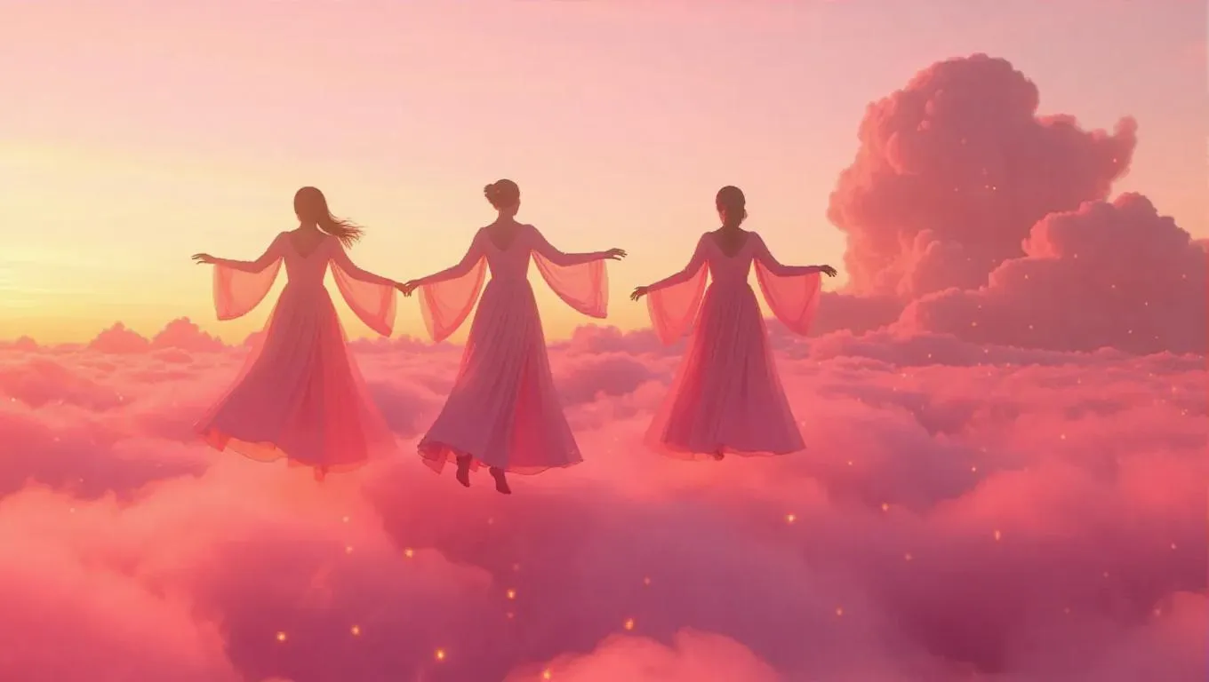 Two ethereal celestial beings waltz across a vast sea of pink clouds, their robes woven from the threads of twilight and daybreak. Each graceful leap sends shimmering ripples through the air, awakening dormant fireflies that dance in glowing spirals, while the wind hums an ancient, mystical melody.
