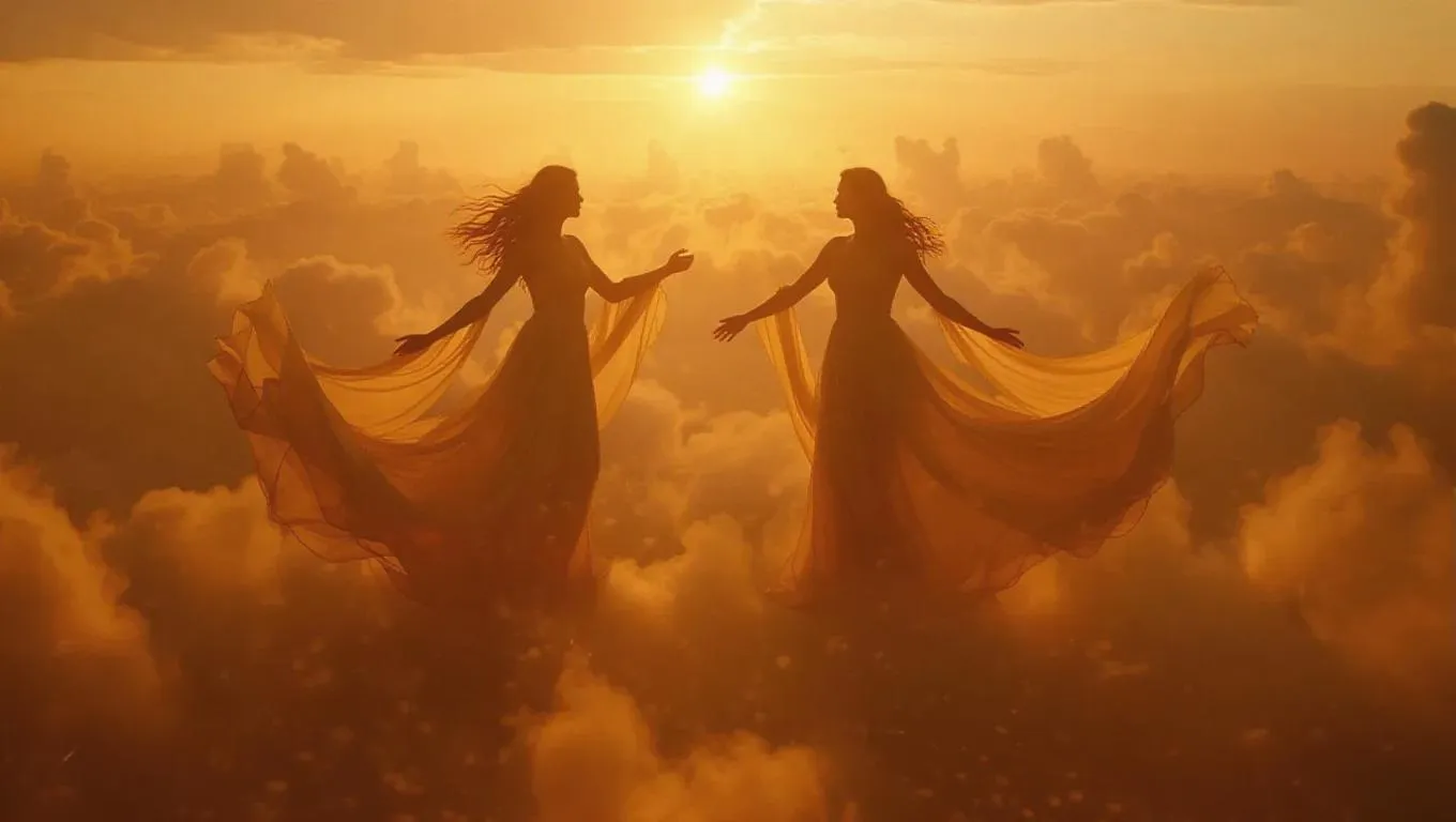 Two ethereal celestial beings waltz across a vibrant sea of golden clouds, their robes woven from the threads of twilight and evening. Each graceful leap sends shimmering ripples through the air, awakening dormant fireflies that shimmer in glowing spirals, while the wind hums an ancient, mystical melody.