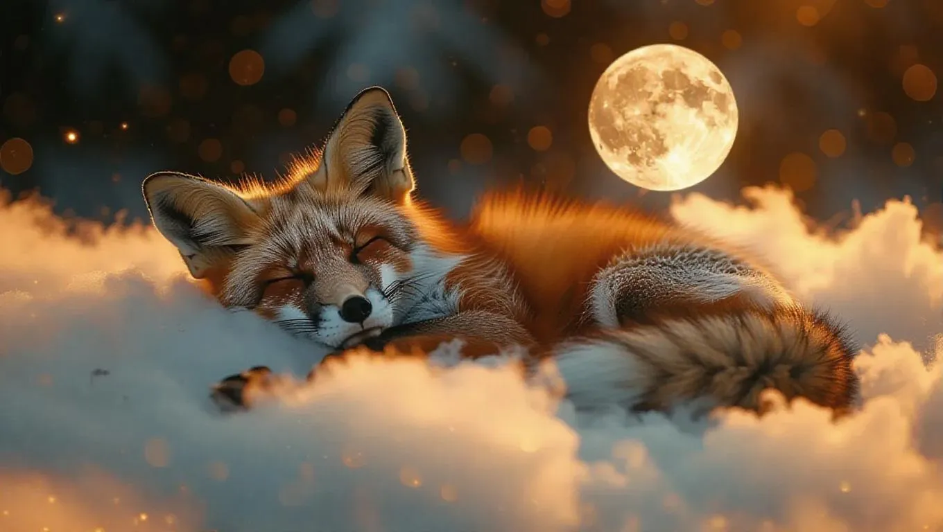 Text to ImageA fox napping peacefully on a soft cloud, illuminated by the soft, twinkling glow of distant stars, surrounded by light fog and shimmering moonlight, creating a calm and beautiful atmosphere.Recreate