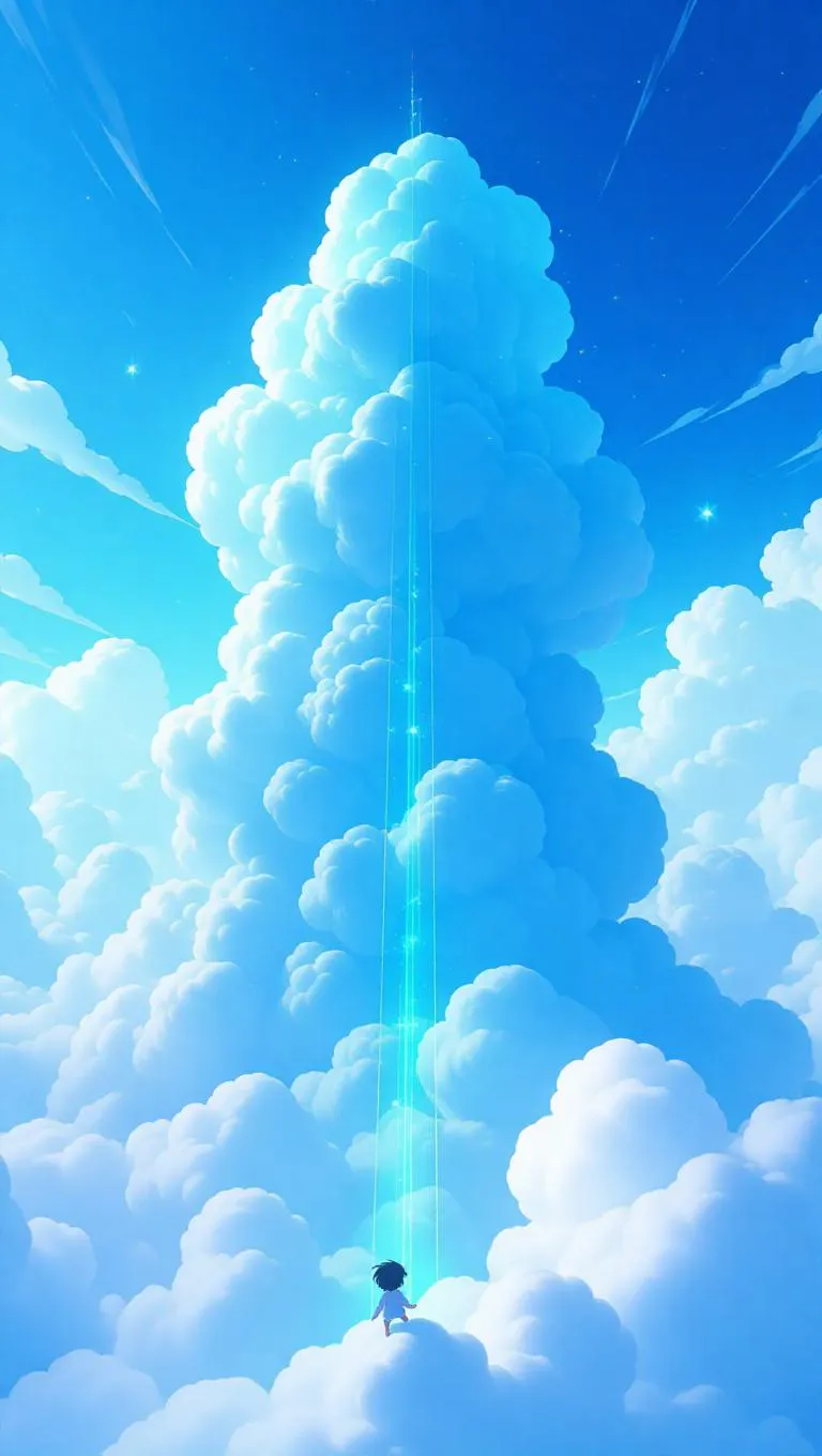 4. Towering cloud slides tumble down from the deep azure sky, their surfaces dusted with twinkling fairy dust. Children slide down at breakneck speed, leaving behind long, luminous trails of starlight that arc elegantly through the air. At the base, a soft, fluffy cloud trampoline awaits, and every joyful jump sends countless sparkling specks flying into the mystical atmosphere.