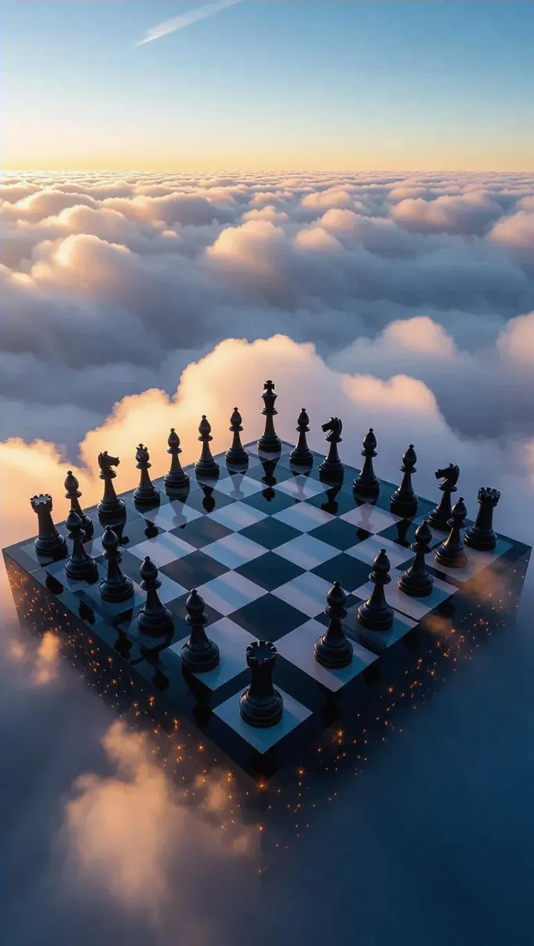 A colossal, shimmering chessboard floats serenely above the clouds, its black and white squares crafted from flickering embers. Each square glows softly, edges lined with floating lanterns. Massive, living chess pieces—knights as elemental spirits, bishops as ancient guardians—move gracefully, casting long shadows on the cloud-sea below.