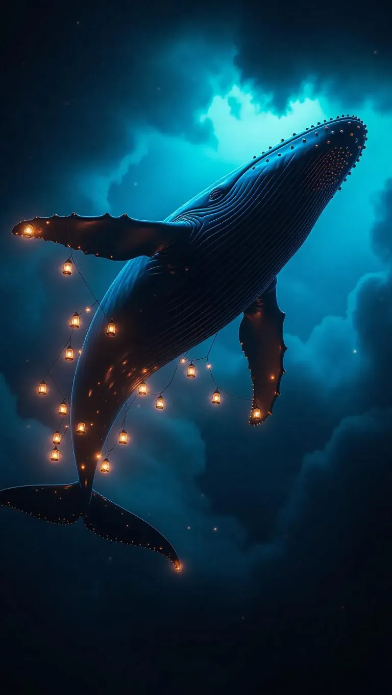 A colossal whale soaring through a twilight sky, gliding gracefully over dark storm clouds, with glowing lanterns entwined around its body, casting a mystical glow, creating a surreal and enchanting scene