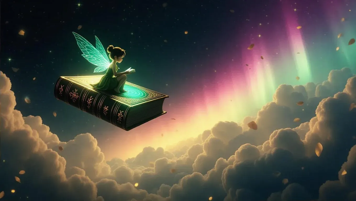 A small, luminous pixie perches on an ancient, fantastic book afloat in mid-air, its pages shining with brilliant jade runes. Surrounding them, fluffy cotton-like clouds extend into infinity, adorned with drifting ornaments and soft golden petals, while a colorful aurora glows gently in the starry sky.