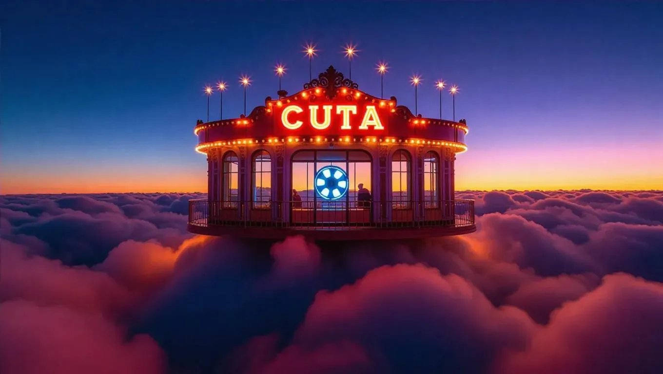 Above the clouds, a vintage cinema perches on a fluffy cloud platform. Its bright walls shimmer with twinkling starlight, and a glowing film reel sign beckons visitors. Large windows frame breathtaking views of the sky, allowing nostalgic light to flood the cozy interior.