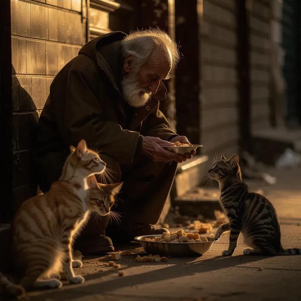 Generate award-winning AI imagery of a homeless man's selfless act—sharing food with stray animals. Explore empathy in adversity with vivago.ai's AI photo effects & editing tools for poignant, professional visual storytelling.