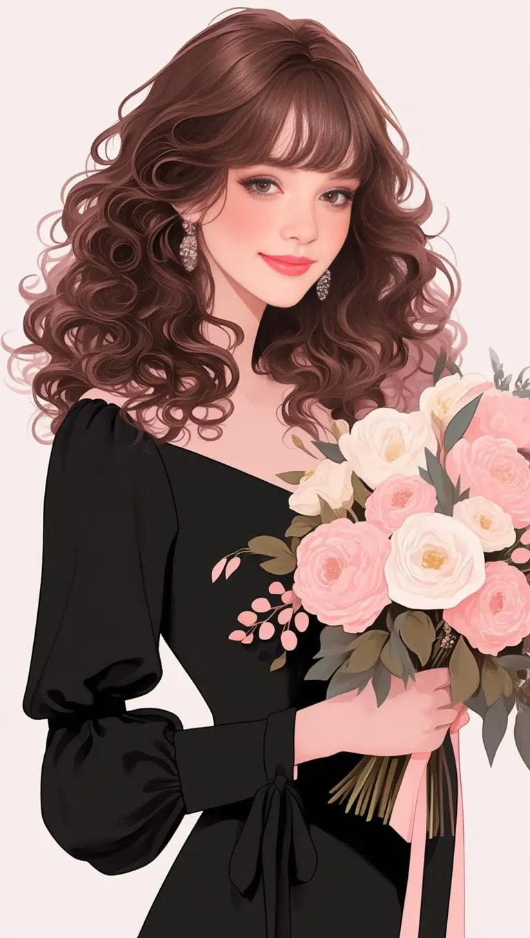 Create elegant AI portraits with Vivago.ai. This romantic illustration features a woman with curly brown hair, wearing a blackpink dress, holding a large bouquet against a white background. Achieve pastel elegance, delicate detailed lines, and a fashion or wedding illustration style. Transform your vision with AI.