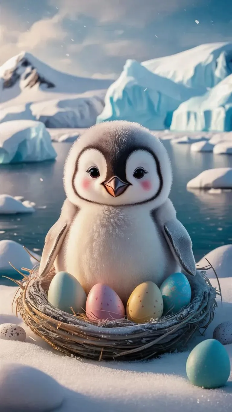 Generate an adorable AI image of a cute penguin guarding eggs in a vivid Antarctic scene. Create lifelike wildlife visuals with vivago.ai's text-to-image tools. Perfect for nature-themed content, family visuals, or AI-generated animal art. Explore professional editing effects for charming results.