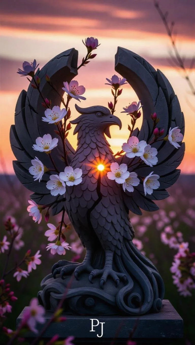 A weathered and broken stone sculpture of a phoenix, its surface cracked and fragmented, exuding a sense of decay and history. Emerging from the crevices and gaps are delicate white blossoms, their vibrant petals contrasting sharply with the cold, gray stone. The flowers symbolize resilience and renewal, creating a striking juxtaposition between the brokenness of the sculpture and the beauty of new life. The background is a tranquil sunset sky, with hues of orange and purple painted across the heavens and a warm, soft light illuminating the scene, enhancing the emotional depth and visual impact. The atmosphere is both melancholic and hopeful, capturing the duality of destruction and rebirth. The art style is highly detailed and evocative, emphasizing the textures of the stone, the fragility of the flowers, and the interplay of light and shadow.