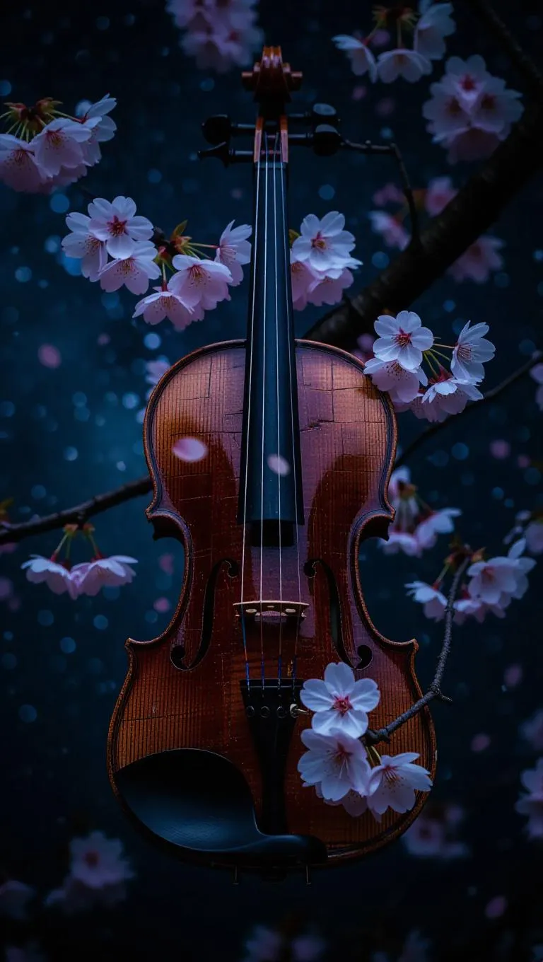 A weathered violin lying under a starlit sky, its wooden body cracked open, with delicate cherry blossoms sprouting from within, petals gently fluttering in the breeze, creating a surreal and enchanting scene
