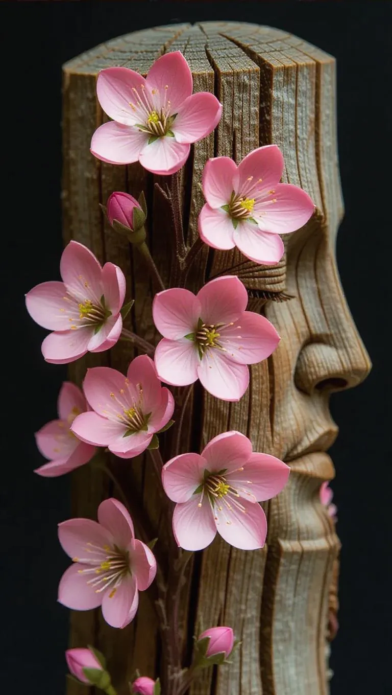 A melted wooden figurine with pink flowers emerging from the cooled surface, symbolizing rebirth and renewal, the delicate petals contrasting with the hardened wood, creating a serene and poetic scene of life after destruction.