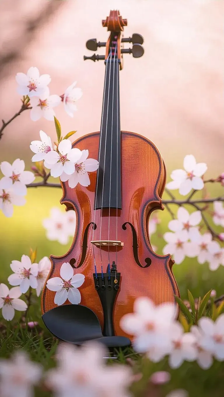 A weathered violin lying in a vibrant spring garden, its wooden body cracked open, with delicate cherry blossoms sprouting from within, petals gently fluttering in the breeze, creating a surreal and enchanting scene