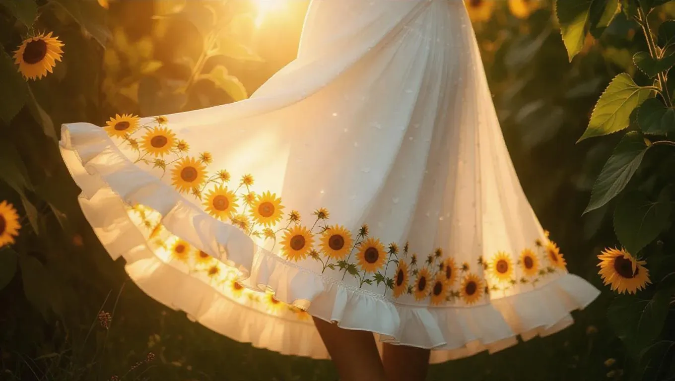 A flowing white dress with delicate sunflowers blossoming along the hem and sleeves, creating a whimsical blend of elegance and natural beauty. The dress sways gently in the breeze, surrounded by soft, bright sunlight filtering through leaves, enhancing the serene and magical atmosphere.