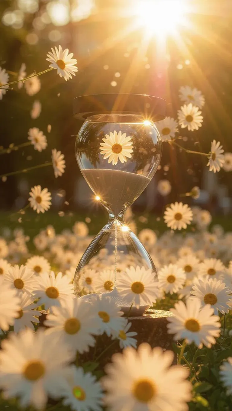 A modern hourglass, with sleek glass, showering bright daisy petals all around, time struggling to break free, surrounded by a clear, bright light, capturing the moment of youthful beauty and freedom in a vibrant urban park.