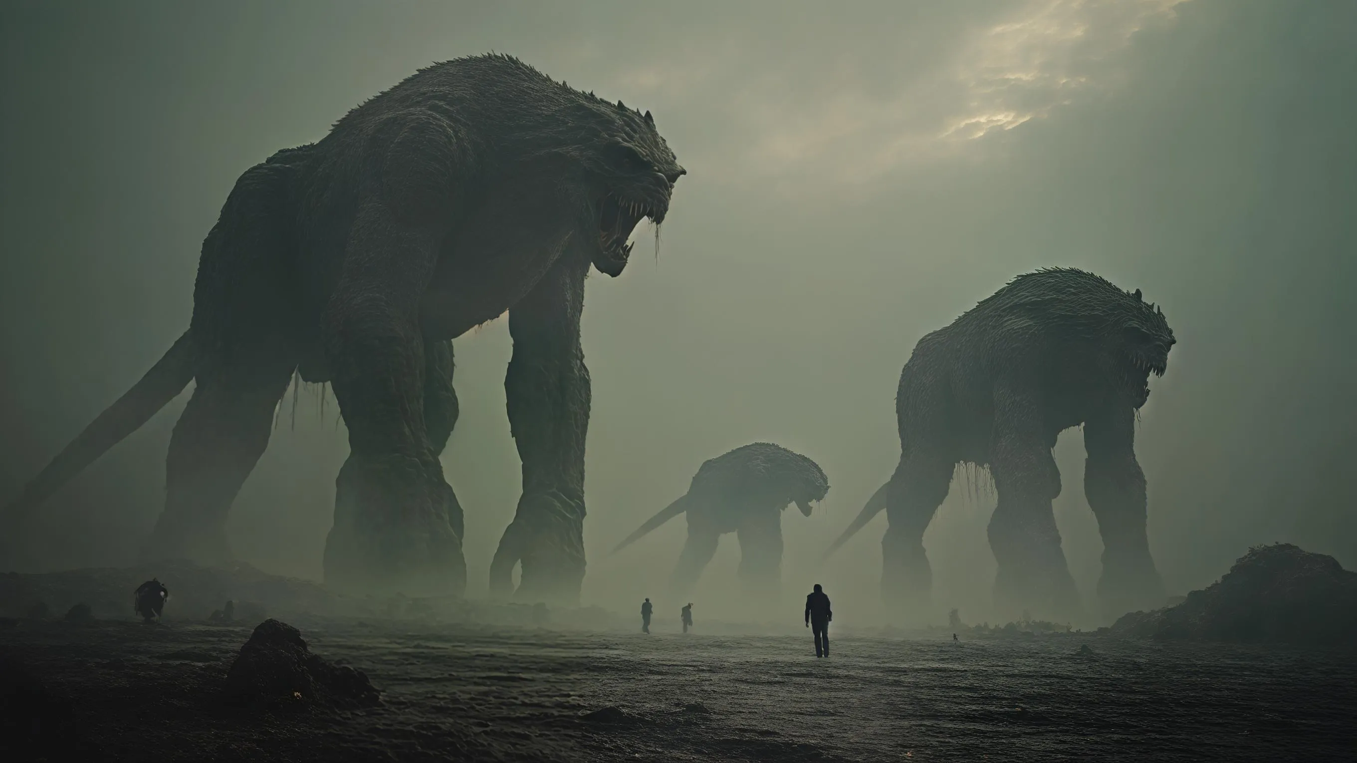 Transform text into haunting visuals with AI. Generate dark cinematic scenes of mythological giants fading into dust, leaving scarred, silent worlds. Experience professional-grade AI art generation for epic, atmospheric imagery with Vivago.ai's creative tools. Create stunning visuals from prompts.