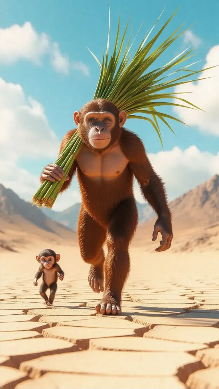 Ultra-realistic 4K AI-generated image of a strong monkey father and curious baby traversing a cracked desert with sugarcane. Cinematic visuals, vivid lighting, and dramatic storytelling evoke themes of hard work and parenthood. Create emotional, high-definition narratives with vivago.ai's AI art tools for professional-grade creative projects.