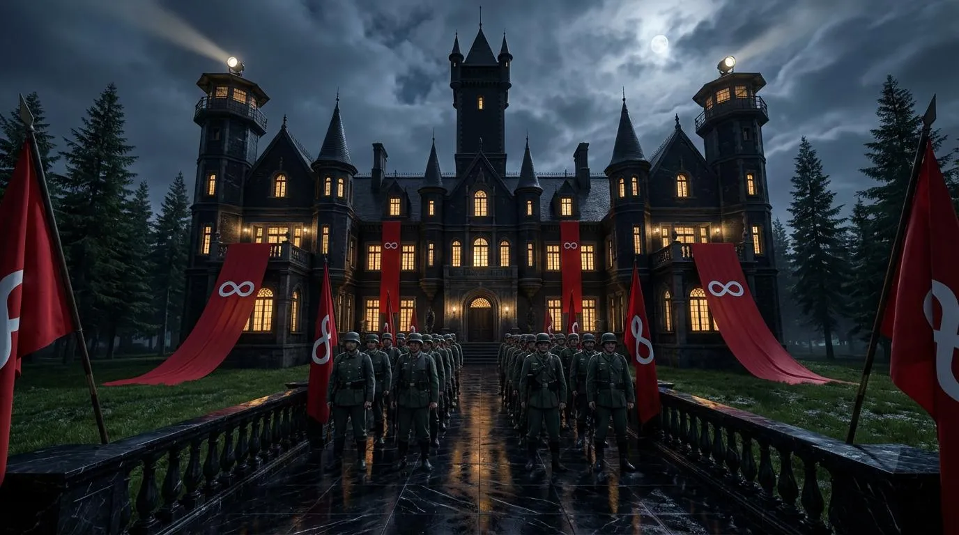 Generate haunting AI visuals: ultra-wide Gothic mansion with infinity-sign banners, sentry towers, and 1940s German soldiers on wet marble walkways. Create dramatic night scenes featuring red flags and towering architecture using vivago.ai's AI image generator tools. Transform text prompts into professional-grade dark fantasy imagery effortlessly.