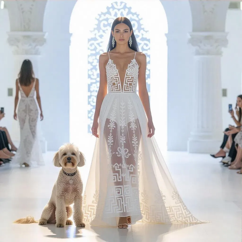 Experience an AI-crafted Paris fashion runway celebrating Greek Easter, featuring a model and her Kokoni dog in flowing dresses adorned with ancient Greek key embroidery. Merging modern haute couture with timeless Hellenic elegance for a serene, powerful ambiance. Elevate visuals with AI-generated Hellenic motifs and haute couture artistry.