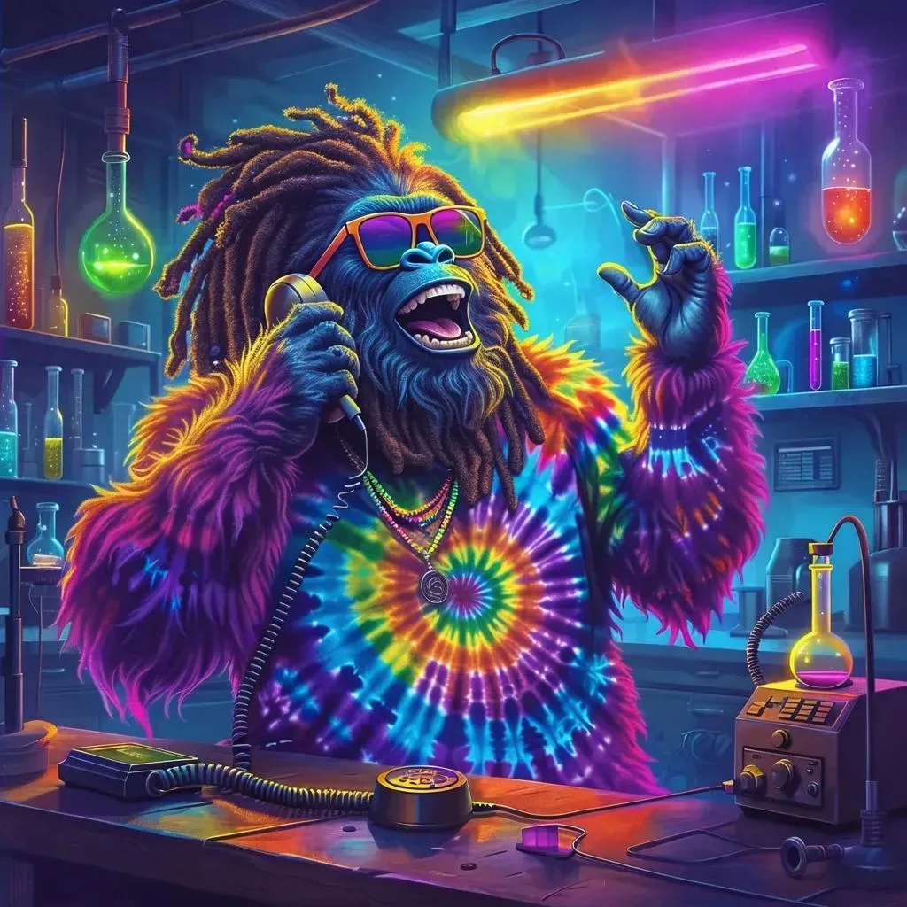 Transform text into vibrant AI-generated art with VivaGo.ai. Create psychedelic digital scenes of a dancing hippie Bigfoot in a lab, featuring tie-dye, reggae dreadlocks, sunglasses, and retro tech. High-definition visuals, intricate details, and surreal flair powered by advanced AI tools for stunning, professional-grade psychedelic artwork.