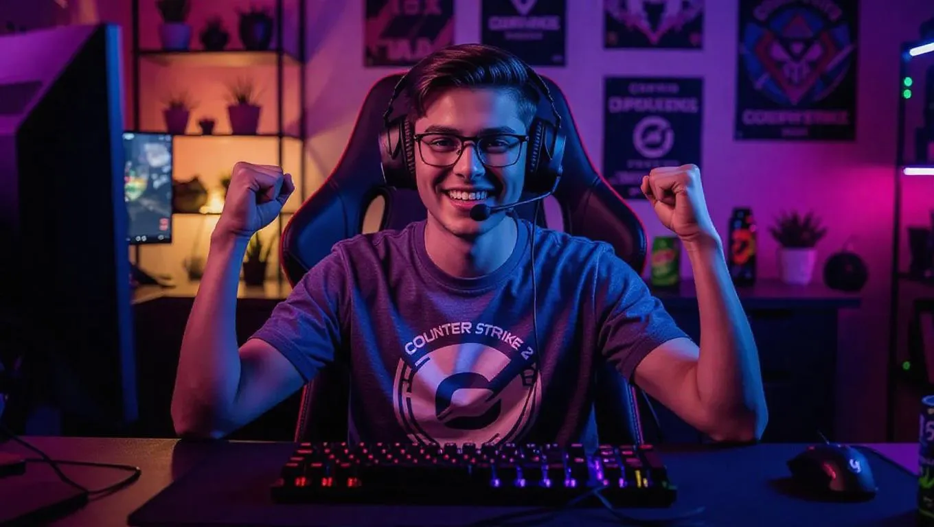Capture the intense thrill of Counter Strike 2 victory in a neon-lit RGB gaming setup. AI-generated visuals showcase a focused gamer with mechanical keyboard, gaming mouse, and victory screen. Shelves of accessories, CS2 poster, and energy drink highlight the immersive scene. Perfect for gaming content creators seeking dynamic, victory-themed AI visuals for streams, posters, or esports branding.