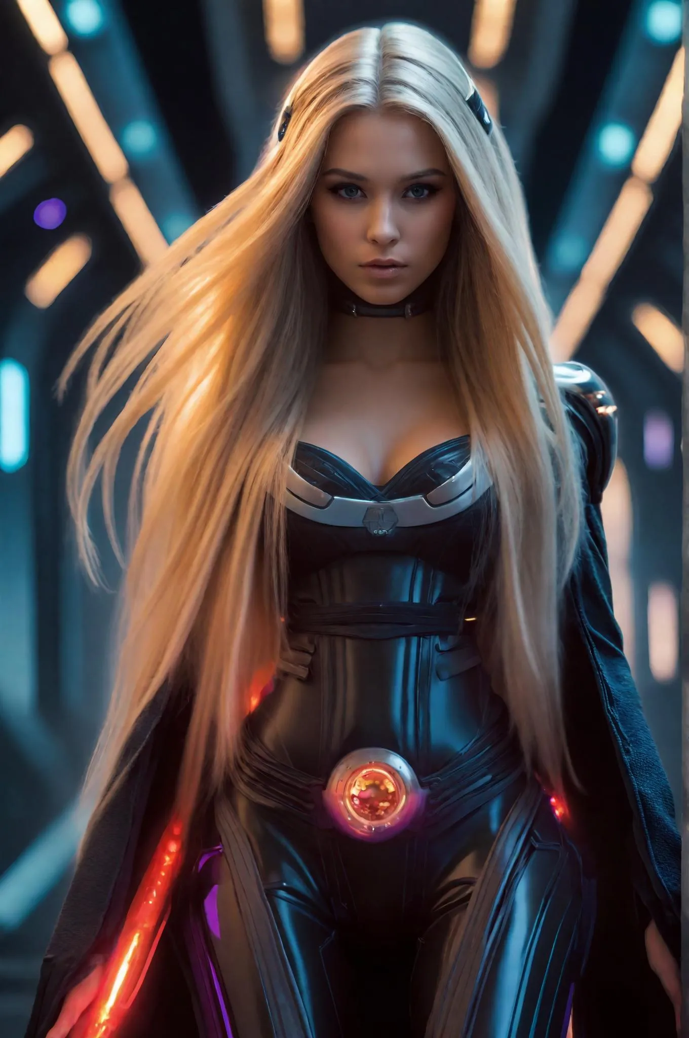 Generate an ultra-realistic AI image of a sexy Sith Rapunzel in form-fitting dark armor, wielding dual luminous lightsabers. Set against a sprawling Star Wars futuristic landscape with holographic interfaces and starships. Dynamic lighting highlights her blonde hair, glowing red eyes, and armor details in cinematic 8K resolution. Perfect sci-fi fantasy portrait.