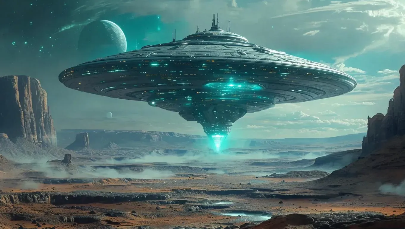 Generate awe-inspiring AI visuals of a colossal futuristic spaceship hovering above a cratered terrain, set against an eerie aqua backdrop. Vivago.ai crafts hyper-detailed sci-fi scenes with advanced AI tools, blending spooky atmospheres and engineered grandeur for professional-grade creative projects. Elevate your imagery with otherworldly landscapes.