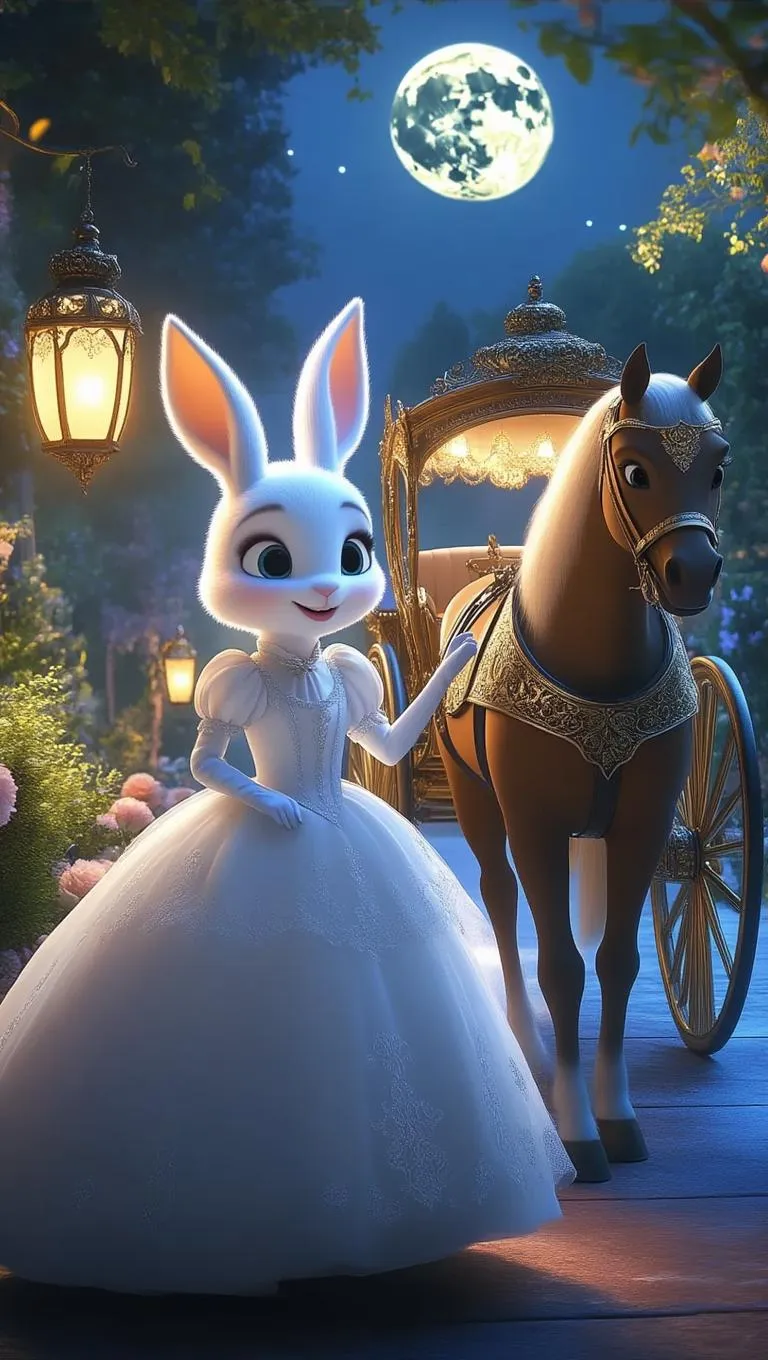 Create magical AI visuals of a moonlit garden party with a white rabbit girl in a chendrella-style dress and her regal father arriving in a luxurious, intricately-patterned horse-drawn carriage. Craft enchanting scenes blending elegance, mystery, and AI-generated storytelling for whimsical night adventures. Transform text into captivating narratives with VivaGO.ai.