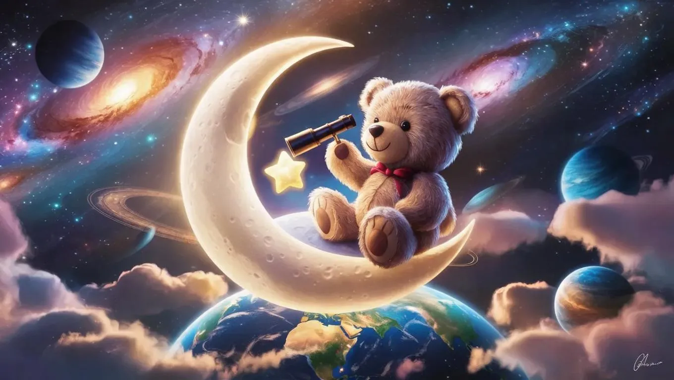 Craft a whimsical 3D cartoon scene featuring a dreamy teddy bear on a crescent moon overlooking a radiant Earth, amidst twinkling stars, vibrant galaxies, and celestial wonders. This uplifting AI-generated art inspires infinite possibilities, blending playful charm with cosmic majesty on Vivago.ai.